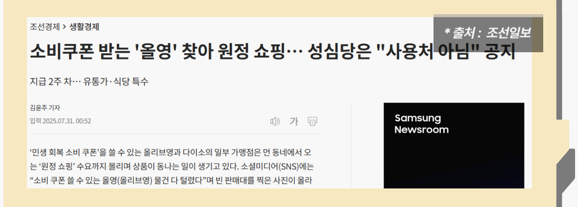 하지만 최근 뉴스에서 보면 소비쿠폰 받는 올영 찾아 원정 쇼핑을 가는 분들이 있다 보니 어느 매장은 인기상품이 모두 판매되어 일부 소비자는 다른 매장까지 물건을 구매하러 가야 하는 상황이 발생할 수 있습니다.