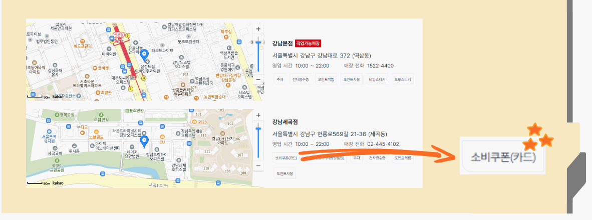 올리브영에서는 매장명을 목록으로 모두 나열하여 찾기(Ctrl+F) 기능으로 검색할 수 있게 하였으나, 다이소에서는 매장을 검색한 후 매장정보 하단에 소비쿠폰 사용 가능 여부를 표기하여 사용처를 구분할 수 있게 하였습니다.